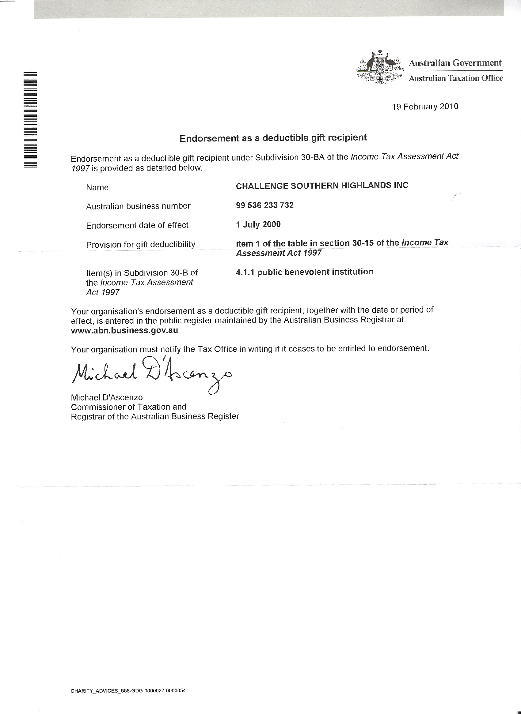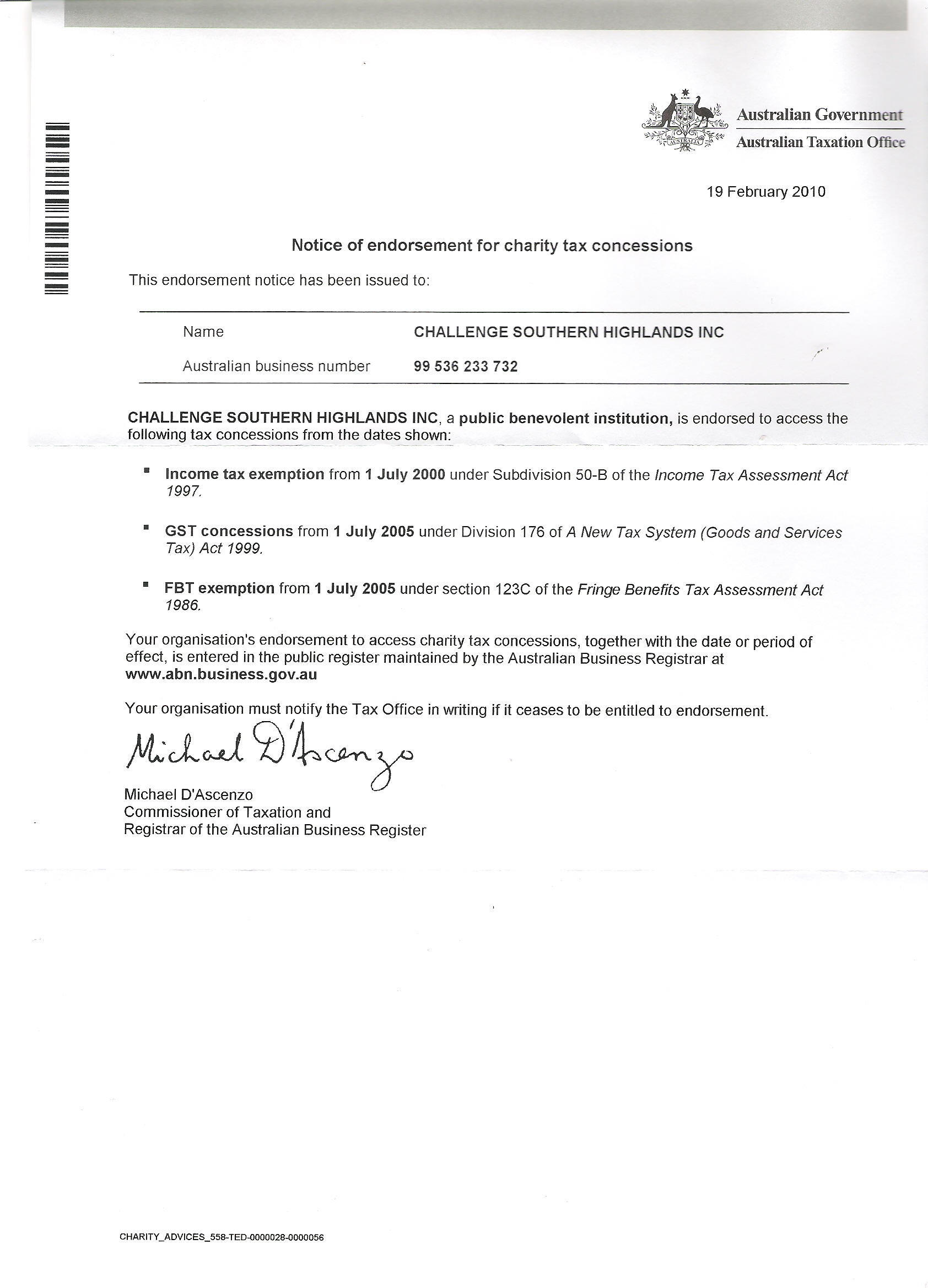 ENDORSEMENT FOR CHARITY TAX CONCESSIONS