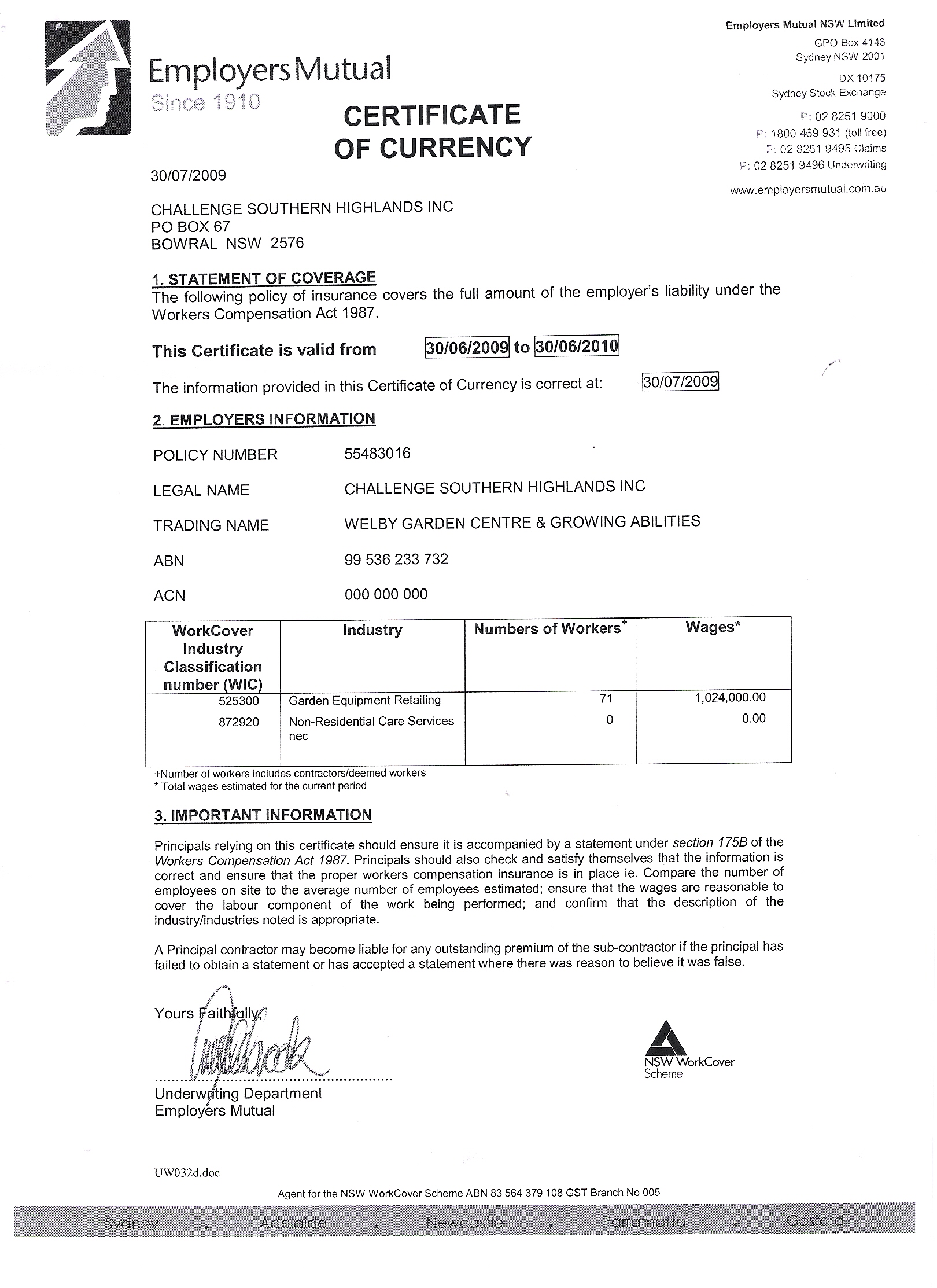 WORKERS COMPENSATION - CERTIFICATE OF CURRENCY